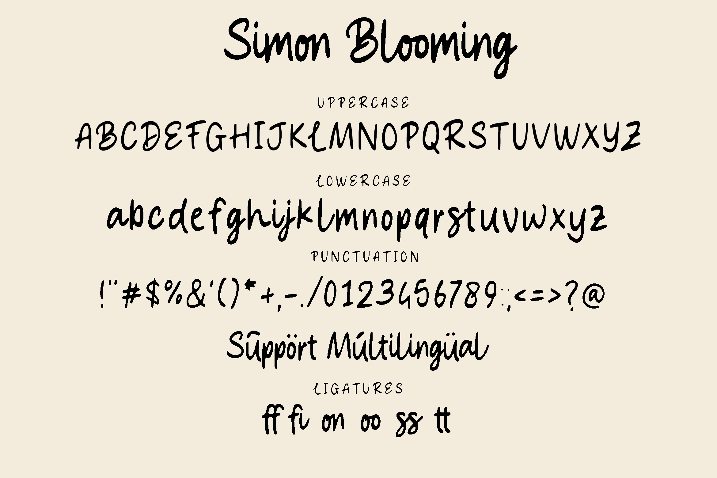 Simon Blooming is a handwritten font that is designed to imitate the look and feel of a real marker pen. It has a smooth and fluid stroke that creates a natural and organic appearance, as if the letters were drawn by hand. This font is ideal for creating a hand-lettered feel in your designs, such as posters, or social media graphics.